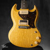 Rabbit Is USA-KO, natural gloss, made in Japan 2021. Is this the weirdest brand of guitar we've had through the shop yet? I mean, Brian was a contender, but this might be the new gold standard. The brand is a project started by Kikuo Yoshioka, the president and founding luthier behind Topshelf favourites Crews Maniac Sound, and kicked off in 2019. They basically offer two shapes: an LP Special DC style, and a 1961 SG style, each in either mahogany or korina. Yes folks: this one is made of genuine solid African korina. A quick search at time of writing showed that if you want a G-branded guitar made of this stuff, you're not getting any change from A$10k, and that would be a deal. Korina has a distinctive look to it: it's a vibrant golden colour with detailed, fine dark 'dog hair' style grain lines; it catches the light beautifully. The body is a three piece build, a departure from the centre joined two piece builds of Crews' KTR series, but there's a reason: it's got a special 'Kittiri joint', where the neck piece extends underneath the neck pickup, much deeper into the body than a regular long tenon, which maxmises contact, strength and resonance. At 2.6kg, it's stupendously light, and somehow,... still well balanced, seated or standing. Korina guitars are famous for their bright, open, clear tone, and this is exactly that: shimmering expansive highs, glorious complex and pithy midrange, and a tight and punchy low end to keep it all together. The neck pickup is warm and rounded with a gooey vocal-like quality, while the bridge pickup is snarly and fat with bristling clarity and cut. It looks clean and classy, and there's a dang cartoon rabbit on the headstock... ask for more, I dare you. The matching gig bag is a quality item and also blessed with the bunny. Life is grand.