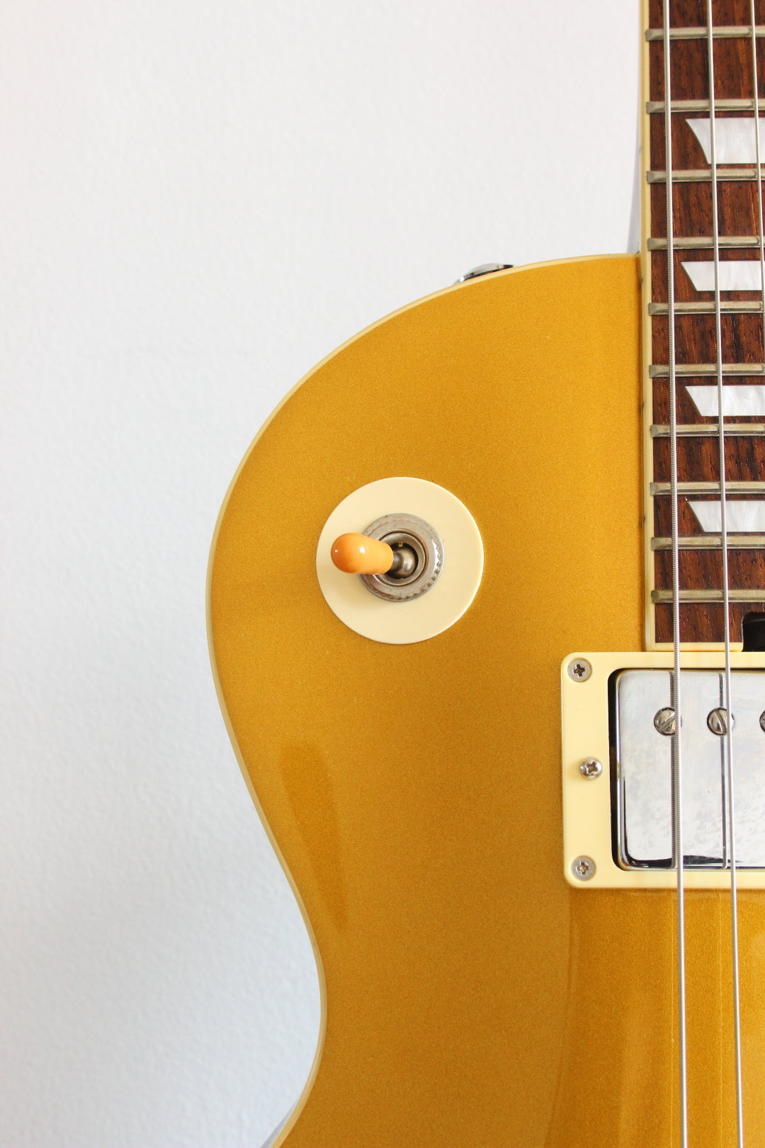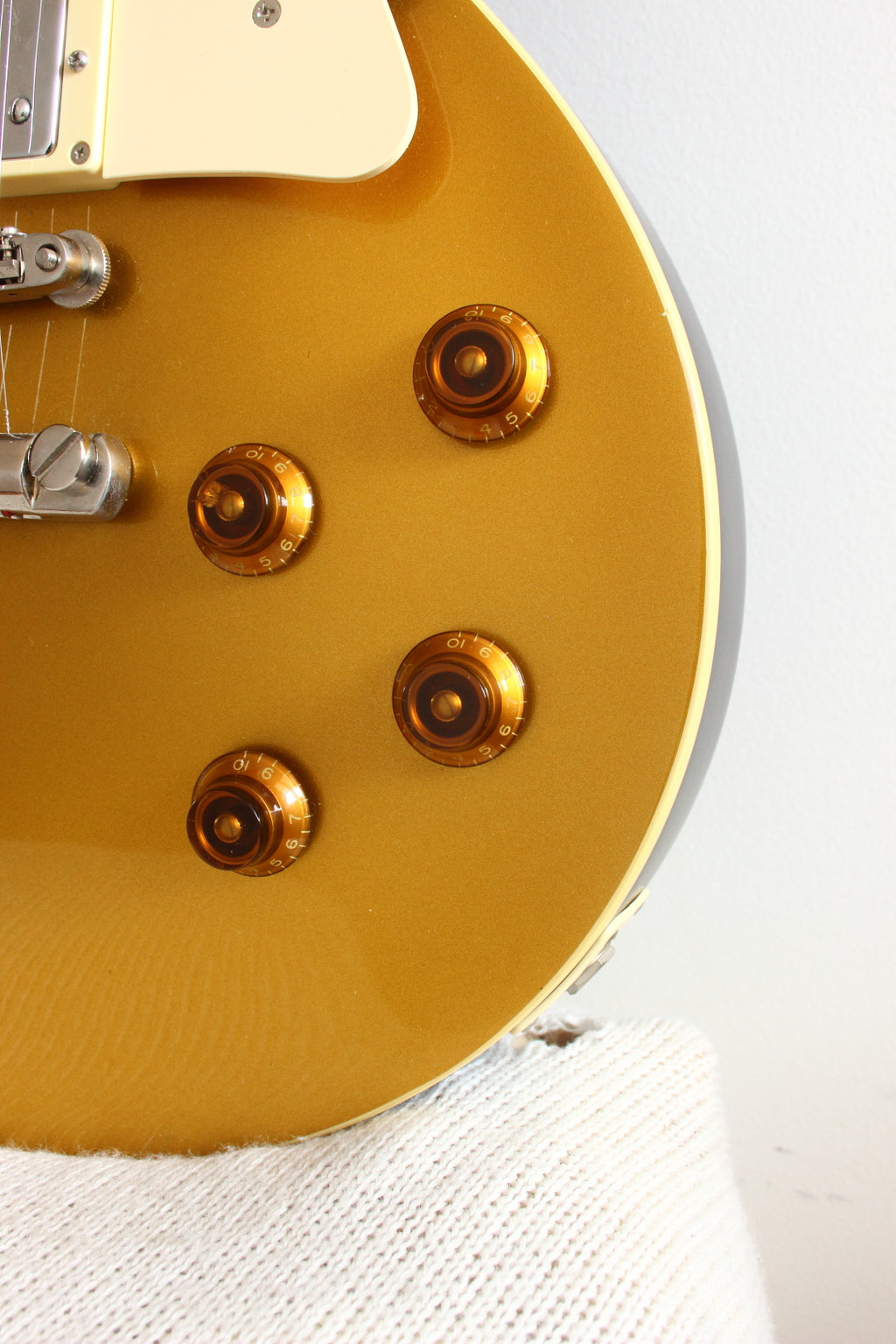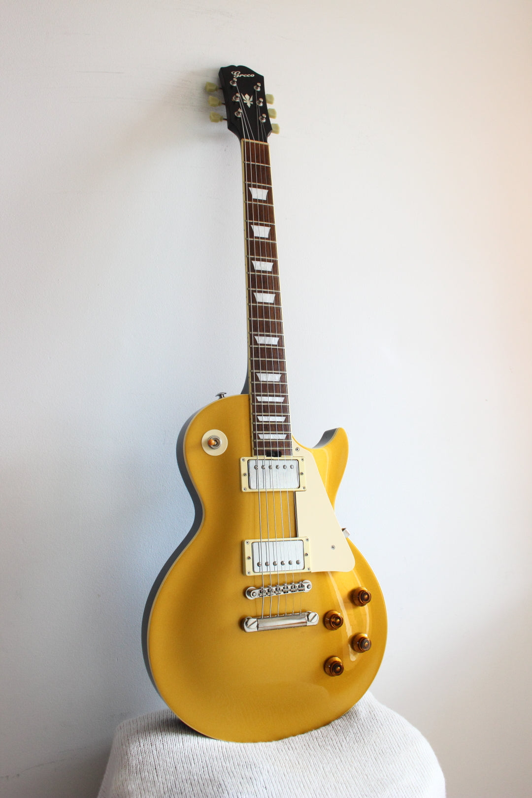 Greco EG-95 Les Paul style, vintage gold, made in Japan 2000. Modern-ish Greco stuff is super nice: the build quality is excellent, and they really do the not-quite-reissue thing really well. What you see here is basically what you get: a pristine gold top LP, but with the easy wheel-style truss rod adjuster and a cool matte-black back and sides. Greco make their own pickups, and these 'Classic Screamin' humbuckers really bring a lot to the table: big thick mids, crunchy tops, fat bass. The 'vintage gold' finish is super sweet; it's a slightly yellow/orange hue and really sparkles beautifully; plus there's barely a mark on it. This will outplay guitars fetching thousands and thousands of dollars, all with a cheeky grin. Really cool guitar!