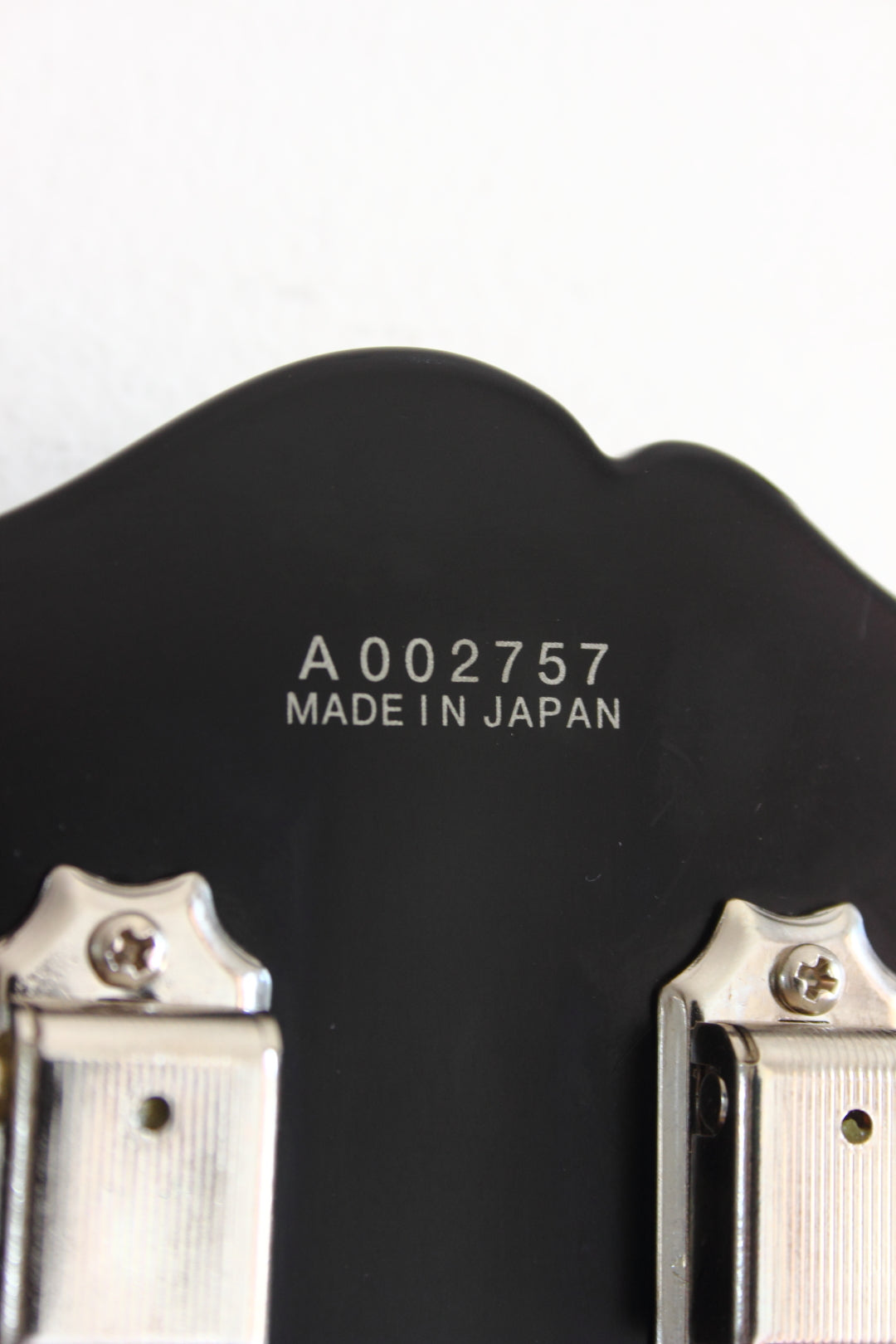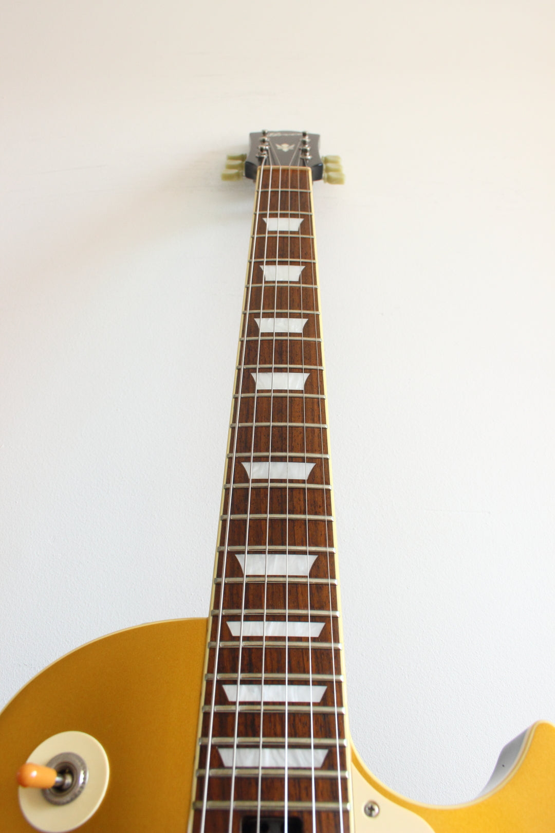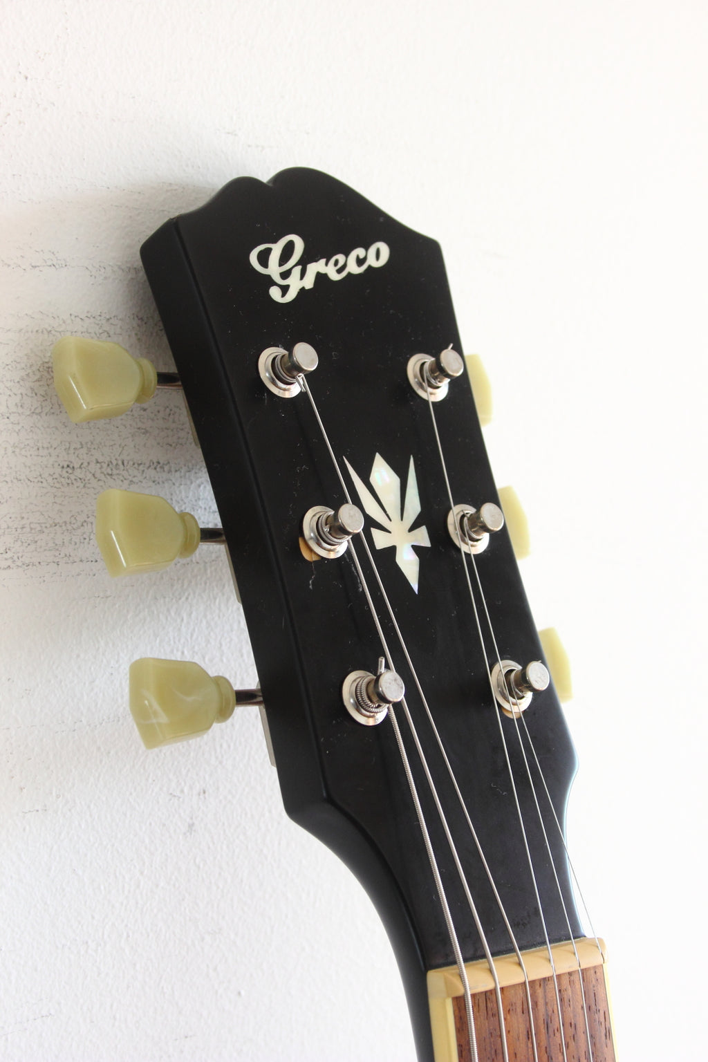 Greco EG-95 Les Paul style, vintage gold, made in Japan 2000. Modern-ish Greco stuff is super nice: the build quality is excellent, and they really do the not-quite-reissue thing really well. What you see here is basically what you get: a pristine gold top LP, but with the easy wheel-style truss rod adjuster and a cool matte-black back and sides. Greco make their own pickups, and these 'Classic Screamin' humbuckers really bring a lot to the table: big thick mids, crunchy tops, fat bass. The 'vintage gold' finish is super sweet; it's a slightly yellow/orange hue and really sparkles beautifully; plus there's barely a mark on it. This will outplay guitars fetching thousands and thousands of dollars, all with a cheeky grin. Really cool guitar!