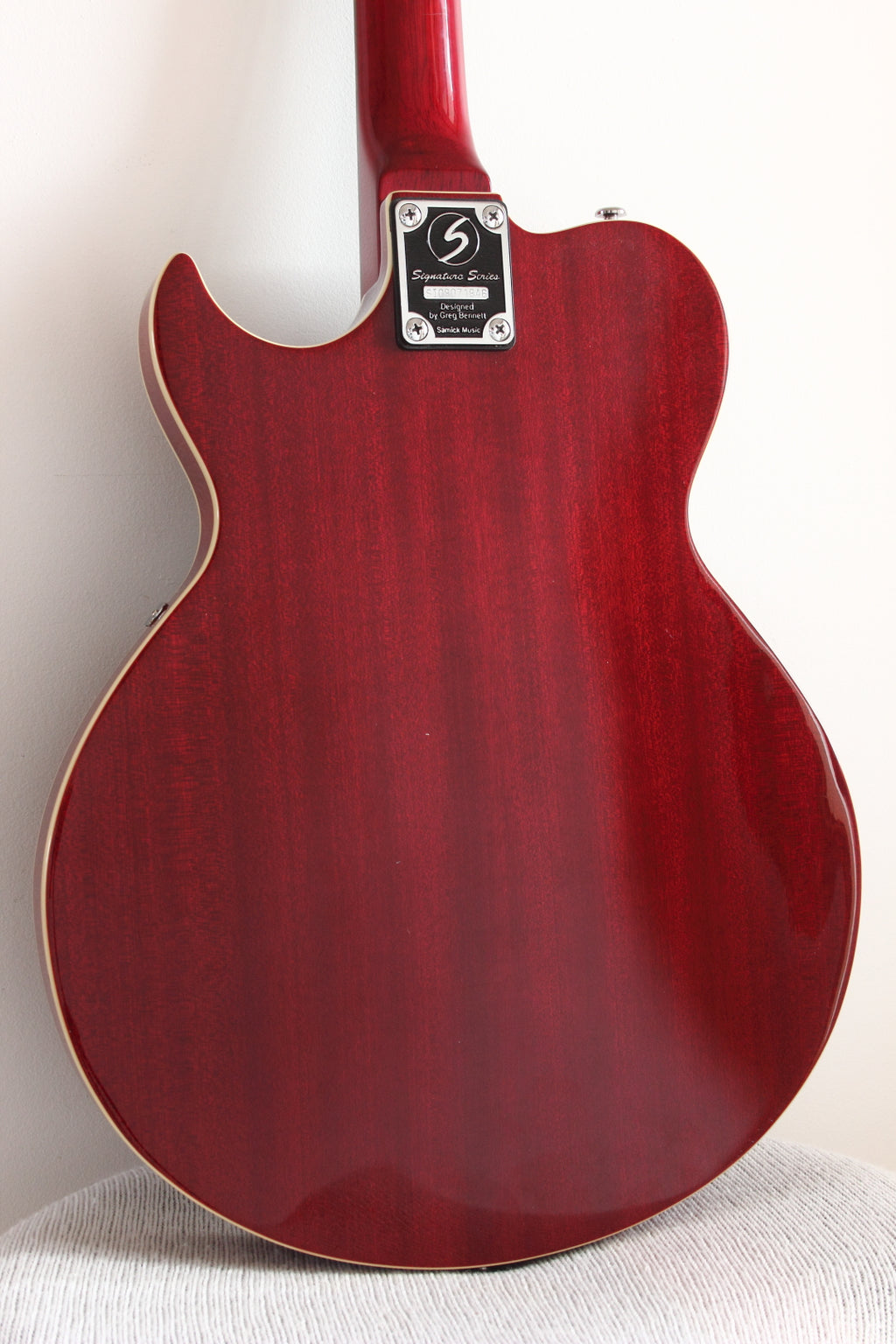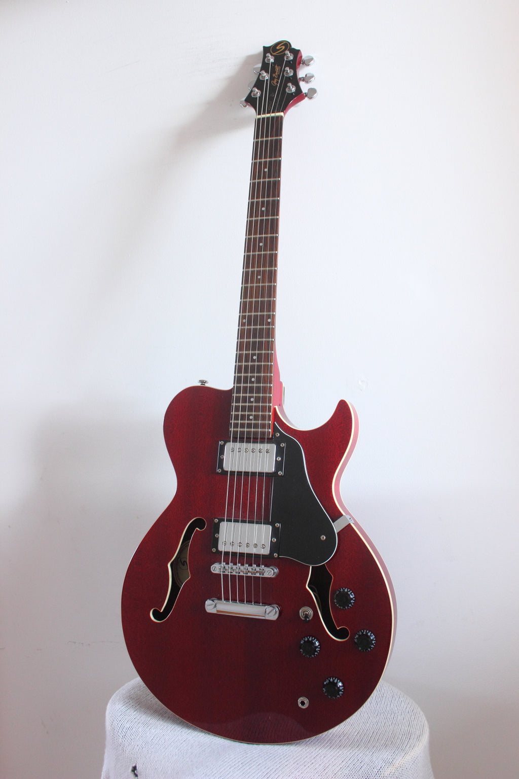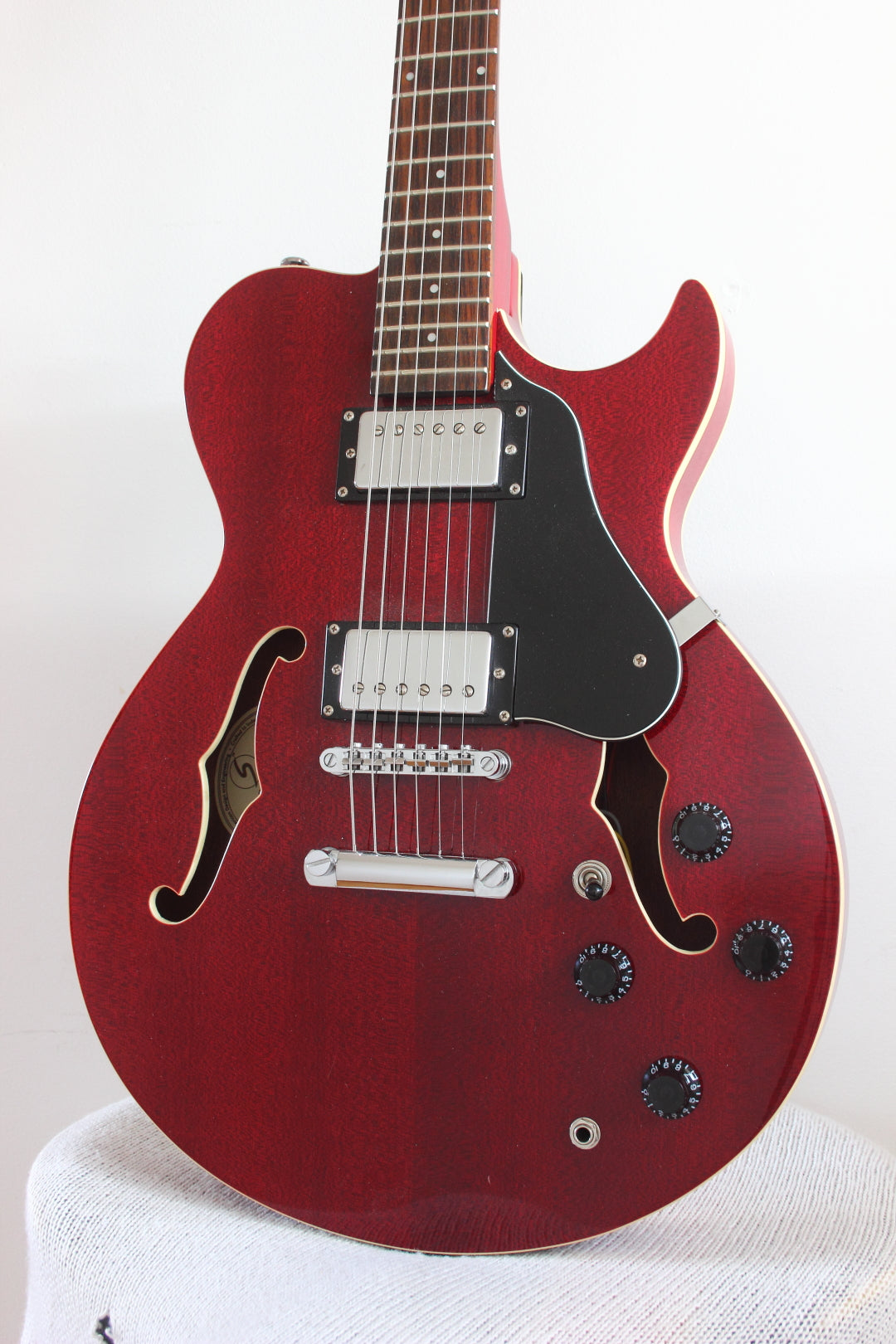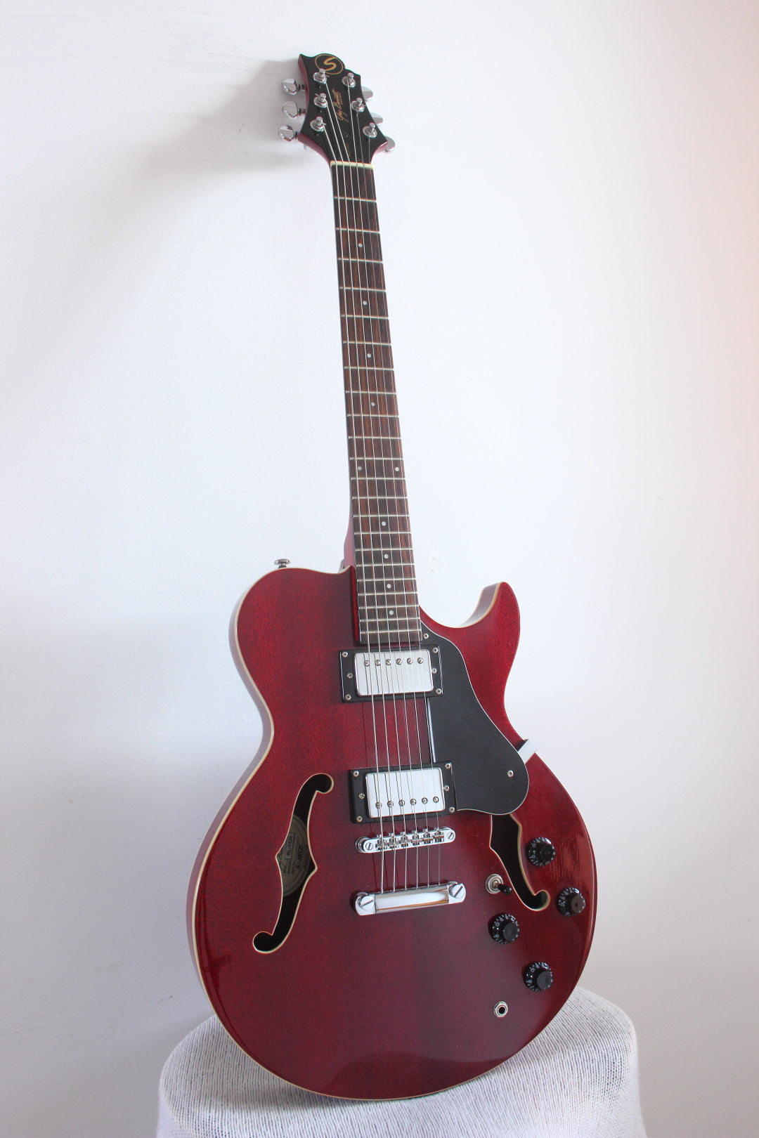 Greg Bennett RL-2 semi-hollow electric. This is a 335-ish design with a twist; the centre block and sides are made from one piece of wood, then the mahogany top, back and neck are attached to that. The guitar offers more attack and sustain than you'd typically see from this shape, it sits somewhere between a a normal 335-type guitar and a solid body LP type. It's got a nice medium-slim neck and feels well-balanced in the hands, it's a handy player. The stock hardware is pretty good, the Gotoh tuners are very stable and the stop tail piece and bridge are sturdy. Tonally, it's got a nice mix of bright and dark, it's smooth with a nice little edge of brightness and cut. That trans-red finish looks good too! This one suffered a headstock break in an unfortunate transit damage incident. It's been expertly repaired to a very high standard by Jon at JP-GW, so it's playing just fine and will do so for many years to come. The new street price on these is around $700, so grab a bargain!