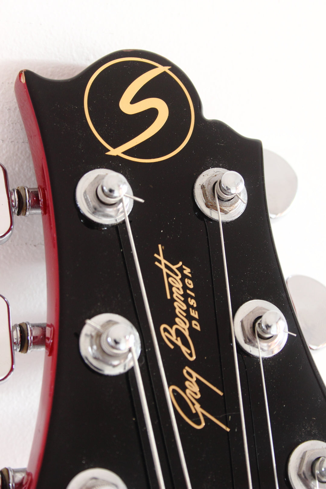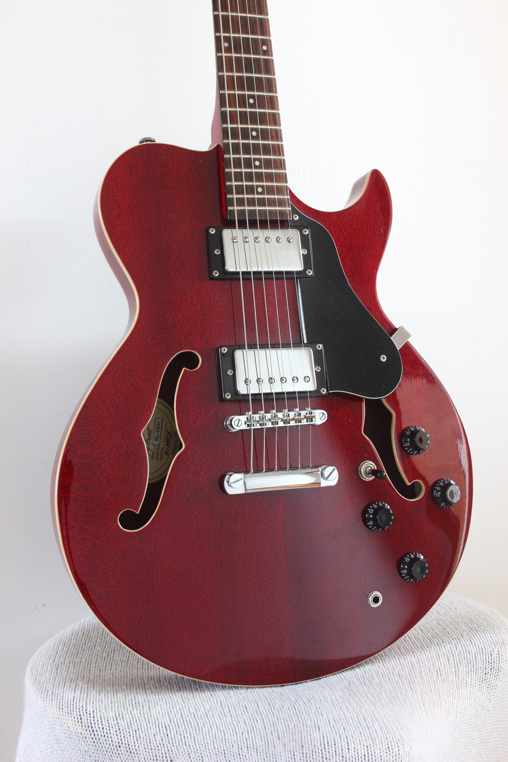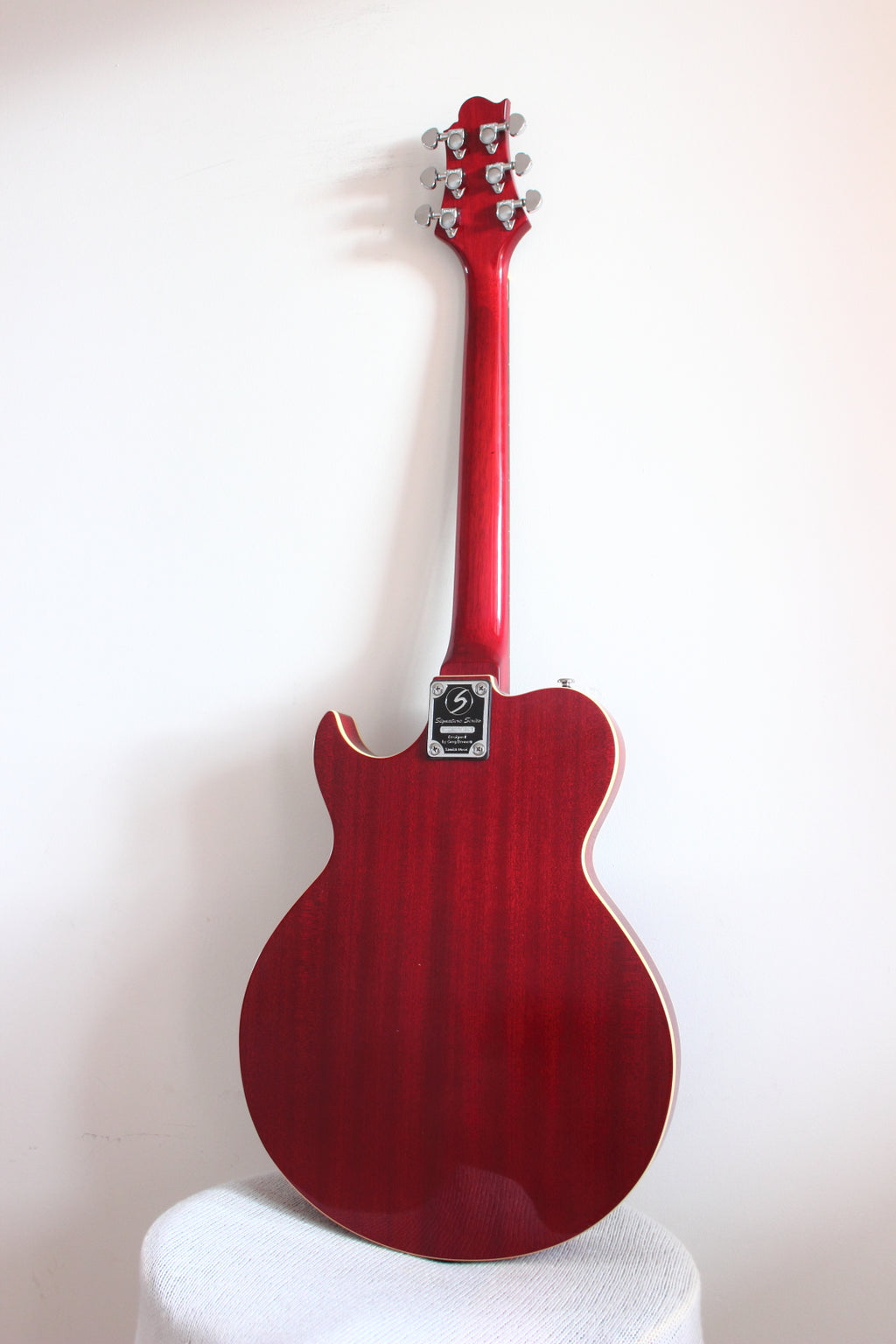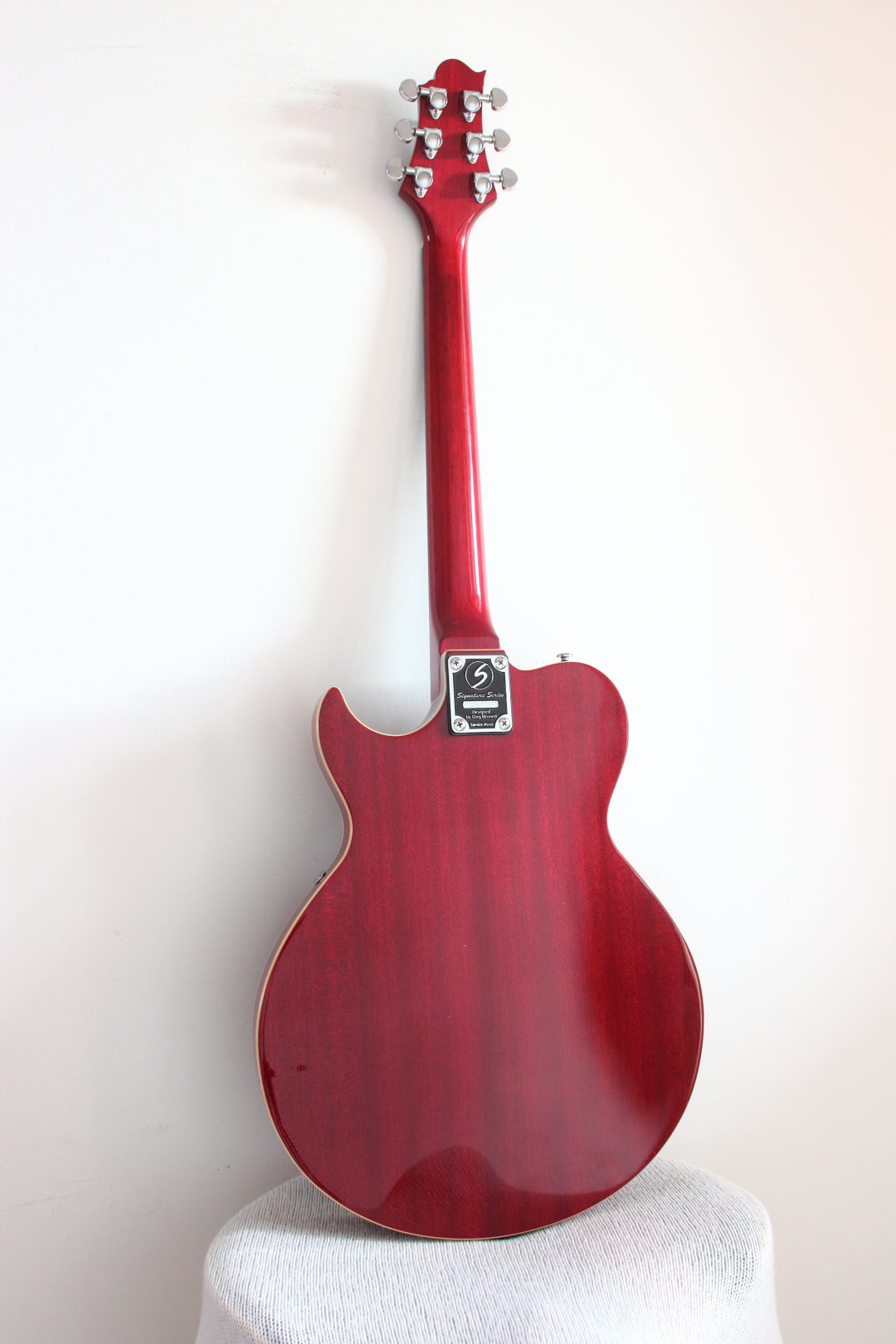 Greg Bennett RL-2 semi-hollow electric. This is a 335-ish design with a twist; the centre block and sides are made from one piece of wood, then the mahogany top, back and neck are attached to that. The guitar offers more attack and sustain than you'd typically see from this shape, it sits somewhere between a a normal 335-type guitar and a solid body LP type. It's got a nice medium-slim neck and feels well-balanced in the hands, it's a handy player. The stock hardware is pretty good, the Gotoh tuners are very stable and the stop tail piece and bridge are sturdy. Tonally, it's got a nice mix of bright and dark, it's smooth with a nice little edge of brightness and cut. That trans-red finish looks good too! This one suffered a headstock break in an unfortunate transit damage incident. It's been expertly repaired to a very high standard by Jon at JP-GW, so it's playing just fine and will do so for many years to come. The new street price on these is around $700, so grab a bargain!
