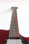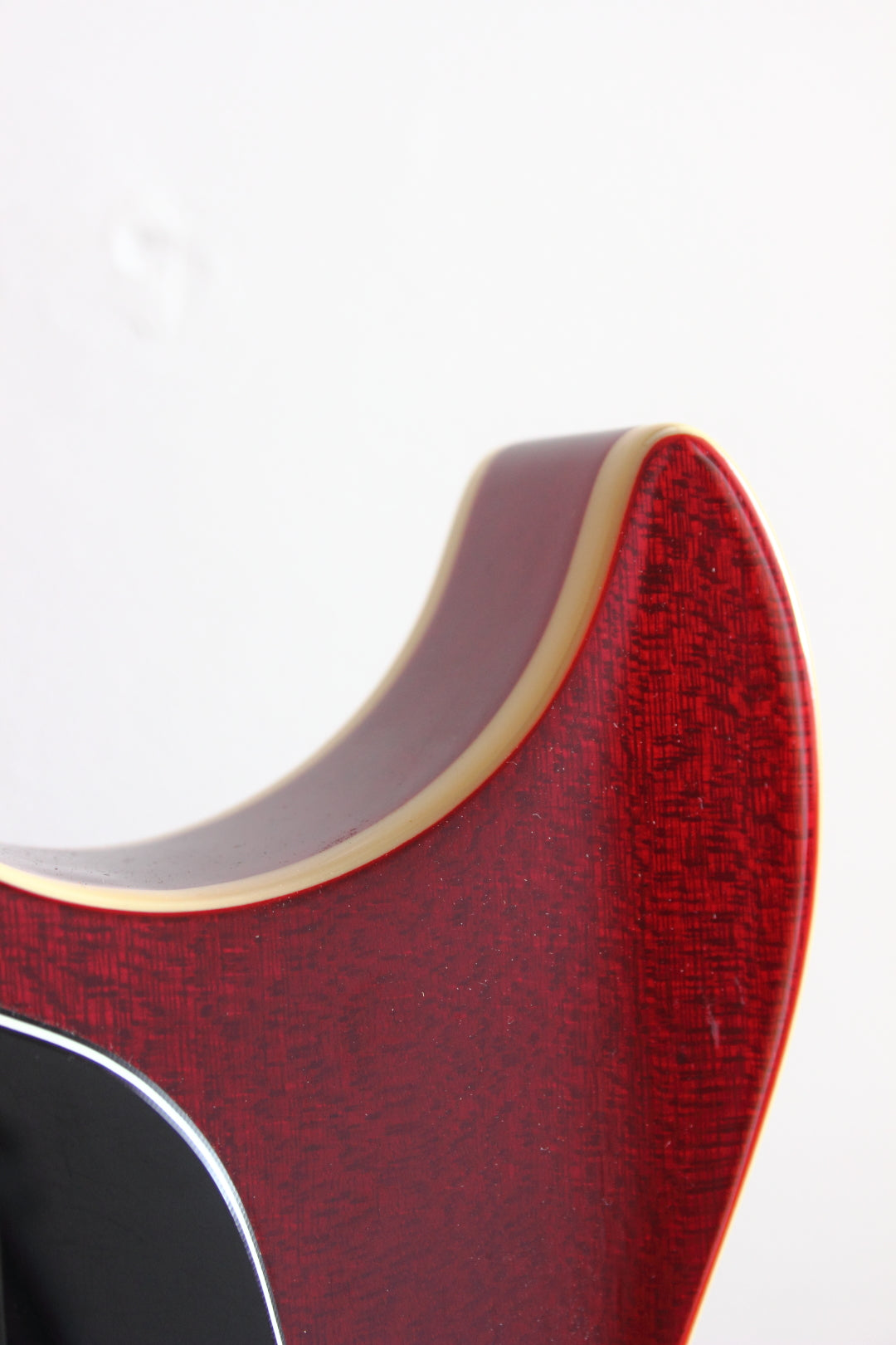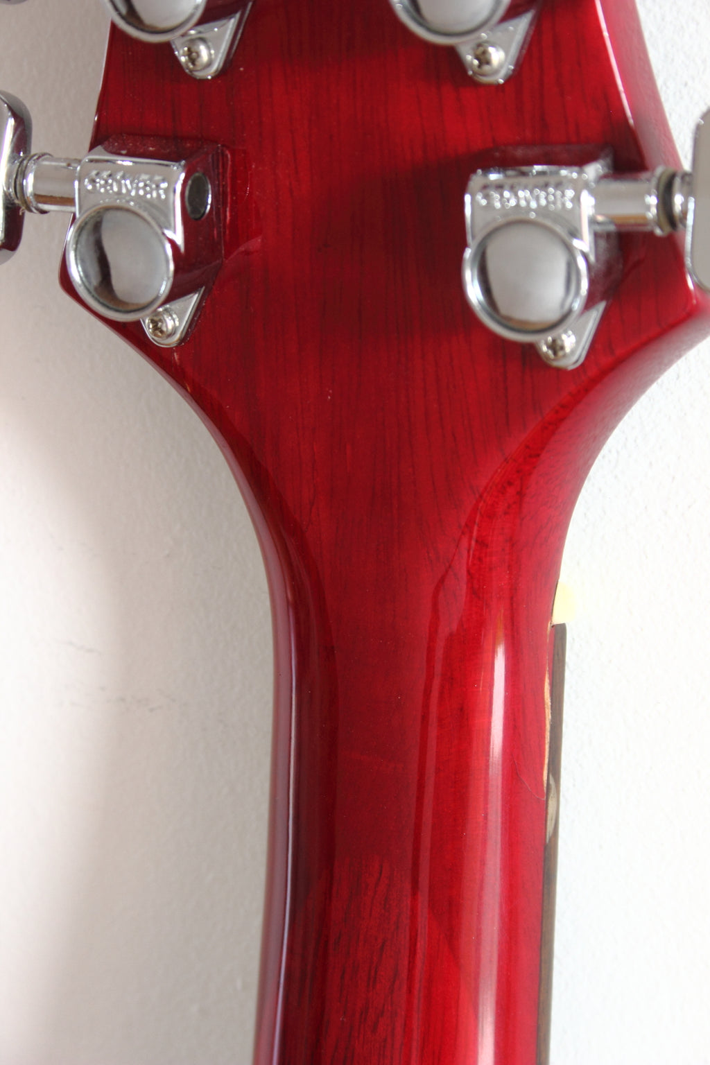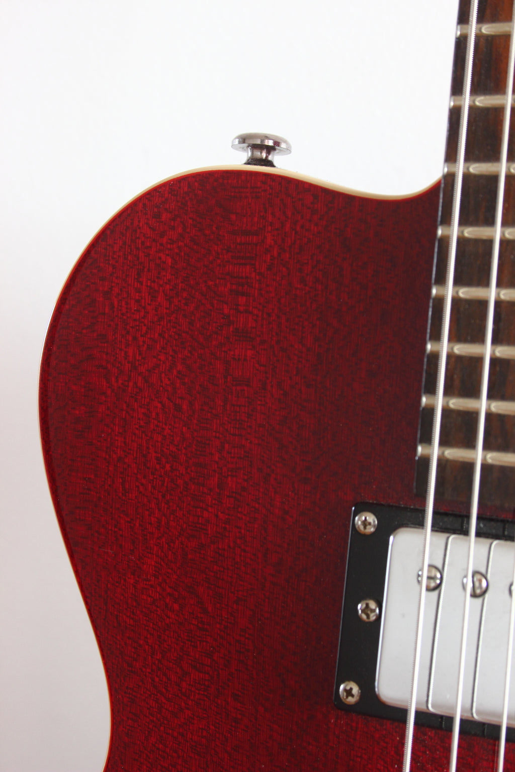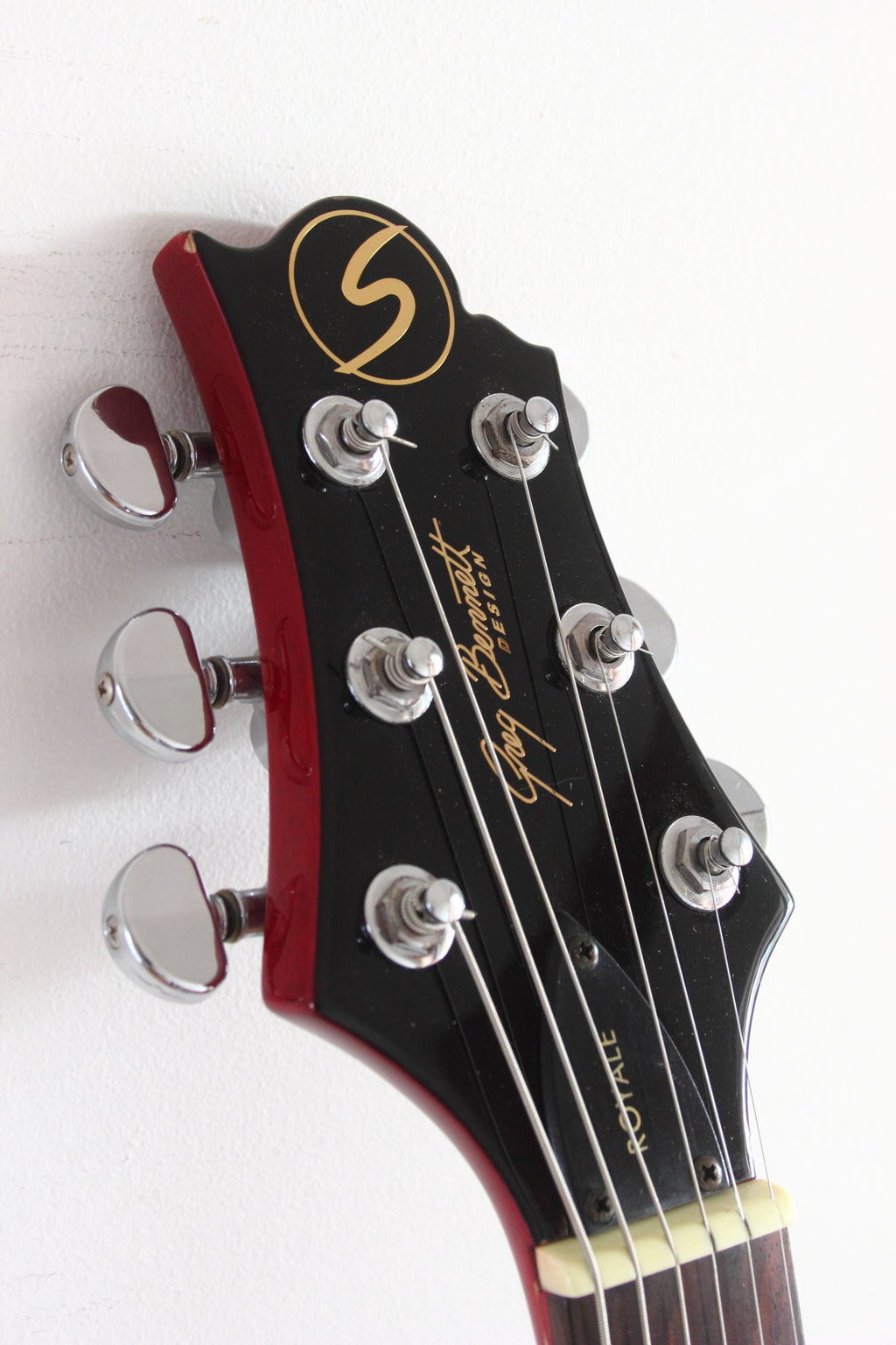 Greg Bennett RL-2 semi-hollow electric. This is a 335-ish design with a twist; the centre block and sides are made from one piece of wood, then the mahogany top, back and neck are attached to that. The guitar offers more attack and sustain than you'd typically see from this shape, it sits somewhere between a a normal 335-type guitar and a solid body LP type. It's got a nice medium-slim neck and feels well-balanced in the hands, it's a handy player. The stock hardware is pretty good, the Gotoh tuners are very stable and the stop tail piece and bridge are sturdy. Tonally, it's got a nice mix of bright and dark, it's smooth with a nice little edge of brightness and cut. That trans-red finish looks good too! This one suffered a headstock break in an unfortunate transit damage incident. It's been expertly repaired to a very high standard by Jon at JP-GW, so it's playing just fine and will do so for many years to come. The new street price on these is around $700, so grab a bargain!